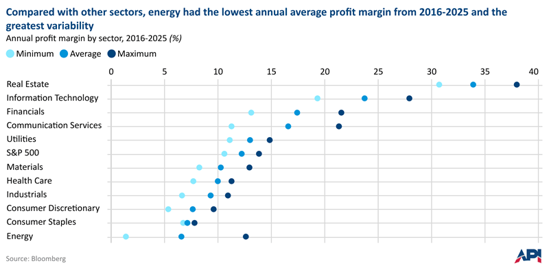 Over time, energy companies have operated with thinner average margins than sectors like technology or financials, while also experiencing wider swings in performance.
